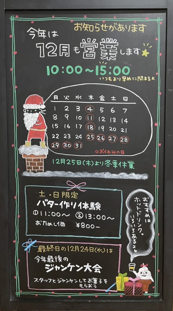 今年は12/24が、最終営業日になります。(木曜日は定休日)